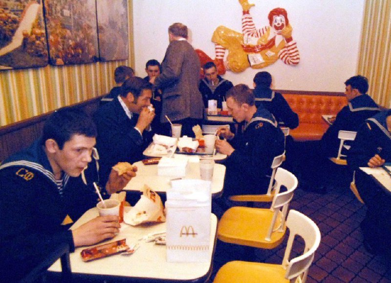 США, Бостон, 12.05.-17.05. 1975 г. Моряки срочной службы больших противолодочных кораблей "Бойкий" и "Жгучий" в одном из ресторанов сети McDonald’s во время известного визита.