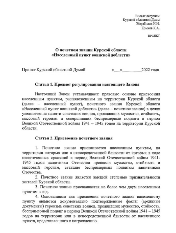 В Курскую областную Думу внесён законопроект о новом почётном звании — «Населённый пункт воинской доблести».