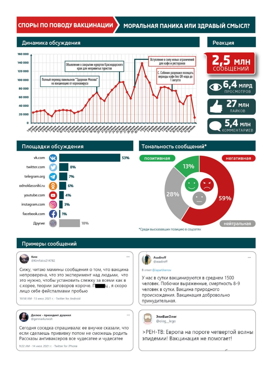 На момент перевода павильонов «Здоровая Москва» на вакцинацию от COVID-19, в русскоязычном сегменте Сети за сутки было опубликовано более 70 000 сообщений на данную тему. Авторов комментариев волновали последствия прививки, многие высказывали свои подозрения по поводу того, что в скором времени процедура вакцинации перейдет из состояния добровольного выбора в в степень принудительной обязанности. Эти подозрения усилила новость о том, что курорты Краснодарского края будут закрыты для невакцинированных граждан. Буквально за сутки обсуждений краснодарских курортов появилось более 90 000 комментариев. Всеобщее обсуждение усилилось и после заявления Сергея Собянина об ограничениях для кафе и ресторанов. Каждый день число сообщений превышало отметку 100 000.