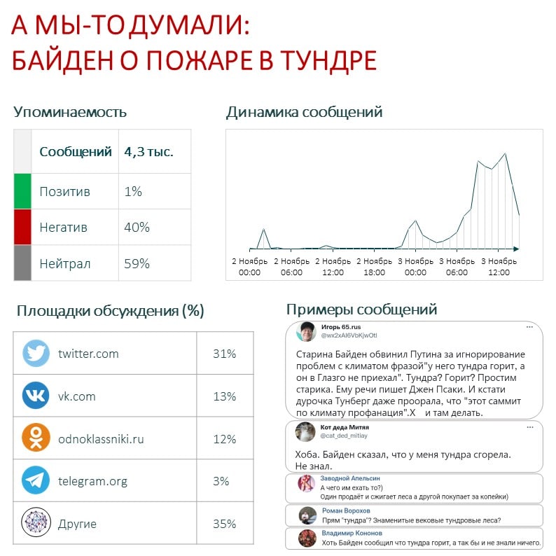 Меньше чем за сутки в Сети появилось более 4 тысячи сообщений о пожаре в тундре. Тональность основной массы сообщений оказалась нейтральной – 59%. Негативных упоминаний было опубликовано 40%, а позитивных всего 1%. Часть пользователей до сих пор не верит возможность происходящего, критикуя слова американского президента, который, по их мнению, не может отличить тайгу от тундры и пытается отвлечь внимание от сгоревшей Калифорнии проблемами другой страны. Другие пользователи еще до конца не разобрались в хронологии событий и теперь в комментариях строят конспирологические теории о том, что пожары в Магаданской области подозрительно начались именно после слов Байдена. Очень многие комментаторы сильно удивились, что тундра действительно горит и высказались о том, что о таких происшествиях россияне должны узнавать от собственных СМИ, а не со слов президента другой страны.