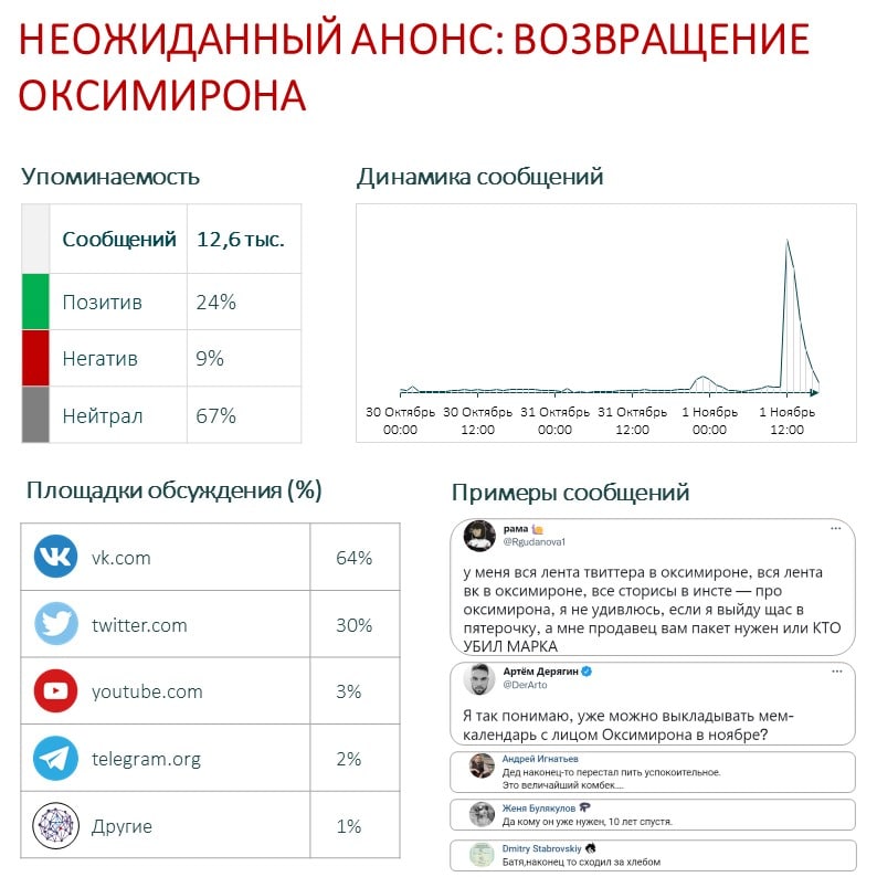 За несколько часов в Сети появилось более двух с половиной тысяч публикаций, посвященных обращению врачей, и число продолжает расти. Письмо медиков почти никого не оставило равнодушным — доля нейтральных публикаций составляет всего 12%. Авторы 51% сообщений поддерживают врачей и отмечают, что если бы не нагнетание антипрививочных настроений, коллективный иммунитет давно был бы сформирован и многих ограничительных мер можно было бы избежать. Негативные публикации, составляющие 37%, как правило направлены против QR-кодов, «принудительной вакцинации» или же выражают недоверие любой инициативе, поддержанной властью, в чем бы эта инициатива не заключалась.