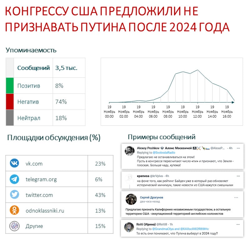 За несколько часов в Сети появилось более трех тысяч сообщений на эту тему, и количество публикаций продолжает увеличиваться. В обсуждении отмечено лишь 18% нейтральных комментариев, в подавляющем большинстве (74%) авторы разделяют точку зрения российских политиков, считая подобные предложения провокацией. Авторы этих публикаций нередко с сарказмом отмечают, что скорее Конгресс США планирует вмешиваться в российские выборы и манипулировать результатами, чем и объясняется уверенность конгрессменов в победе Владимира Путина на выборах-2024. Готовы согласиться с американскими конгрессменами авторы 8% сообщений — практически все эти комментарии концентрируются в комментариях у известных деятелей оппозиции и в протестных пабликах социальных медиа.