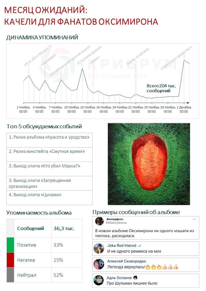 В начале прошлого месяца известный хип-хоп исполнитель Oxxxymiron запустил масштабную рекламную кампанию перед вчерашним релизом долгожданного альбома «Красота и уродство». На протяжении всего месяца происходили всплески упоминаний музыканта, связанные с несколькими событиями: