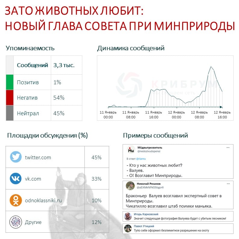 Тональность упоминаний оказалась более чем наполовину негативной – 54%. Нейтральных сообщений было опубликовано 45%, а позитивных всего 1%. В соцсетях пользователи чаще всего публикуют множество разных фото Валуева в окружении убитых на охоте животных, подчеркивая их язвительными комментариями на тему «узаконенного браконьерства». Вместе с этим комментаторы обсуждают недавний скандал, связанный с найденным лосем в багажнике депутата Валерия Рашкина. Авторы таких публикаций выражают непонимание, почему одних после уличения в браконьерстве вскоре лишают депутатской неприкосновенности, а других назначают следить за сохранением природы.