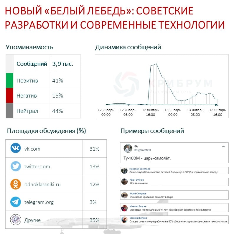 Меньше чем за сутки в Сети было опубликовано около 4 тысяч сообщений, почти половина которых оказались позитивными – 41%. Нейтральных упоминаний оказалось 44%, а негативных всего 15%. Чаще всего пользователи соцсетей обращали внимание на то, что Ту-160М был спроектирован на базе советских разработок, что стало поводом и для позитивных, и негативных комментариев. Для одних модернизация старых проектов оказалось хорошей новостью. По мнению авторов публикаций, совмещение надежных советских разработок с современными технологиями – отличный способ достичь наилучших результатов в отечественном вооружении.