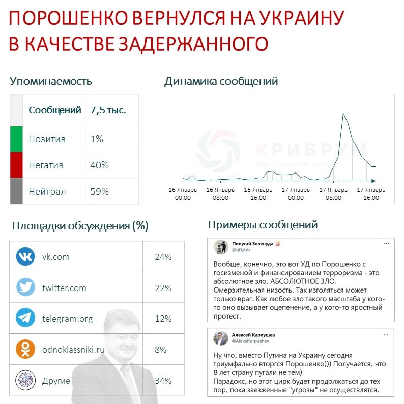 За сутки в Сети было опубликовано более 7 тысяч сообщений, который оказались в основном либо нейтральными (59%), либо негативными (40%). Многие пользователи соцсетей считают, что Порошенко действительно военный преступник. По мнению авторов, Порошенко сегодня выступает в роли «пятой колонны Путина» и приехал «раскачивать лодку», чтобы избежать наказания за совершенные преступления. По мнению других комментаторов, Порошенко уверен, что тюрьма ему не грозит. Первой причиной такой уверенности пользователи называют деньги и влиятельность, второй причиной — опасения Зеленского «новым Майданом», который может быть вызван арестом Порошенко.