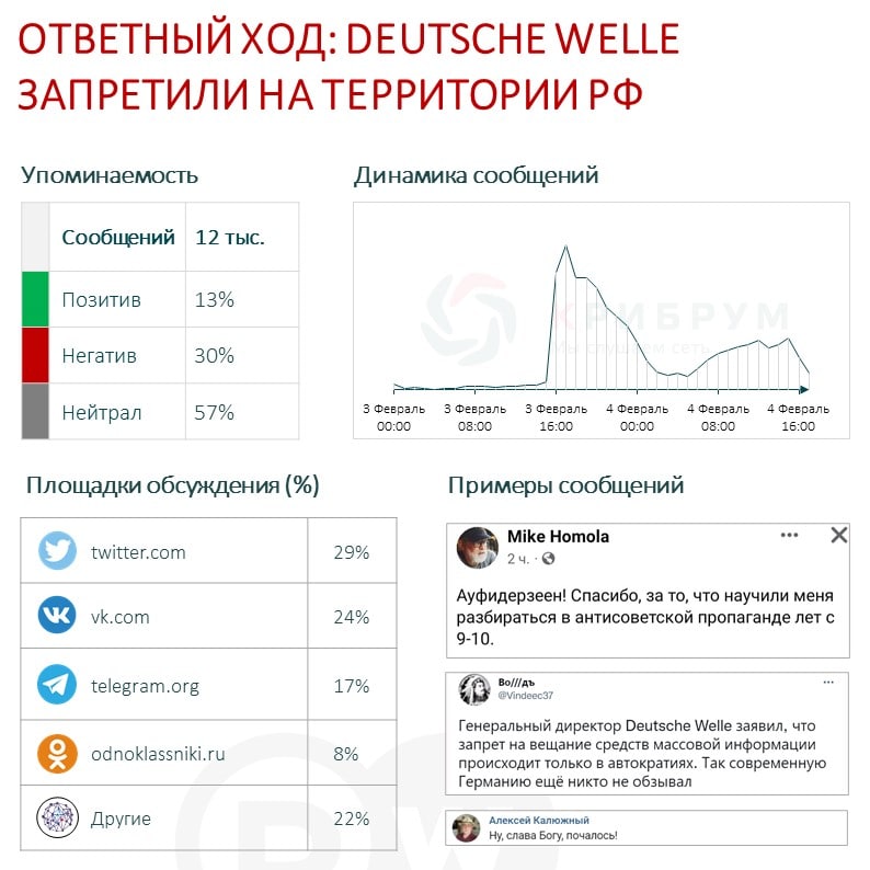 За полтора дня событие вызвало публикацию более 12 тысяч упоминаний в Сети с тональностью в 57% нейтральных, 30% негативных и 13% позитивных. Многие пользователи соцсетей, обсуждая запреты, высказались о том, что вместо DW необходимо было запретить издание покрупнее, поскольку у RT, по мнению пользователей, аудитория намного больше. Также некоторые комментаторы возмутились заявлением МИД ФРГ и выразили недоумение, почему запрет RT не усложнял германско-российские отношения, а запрет DW вдруг осложнил.