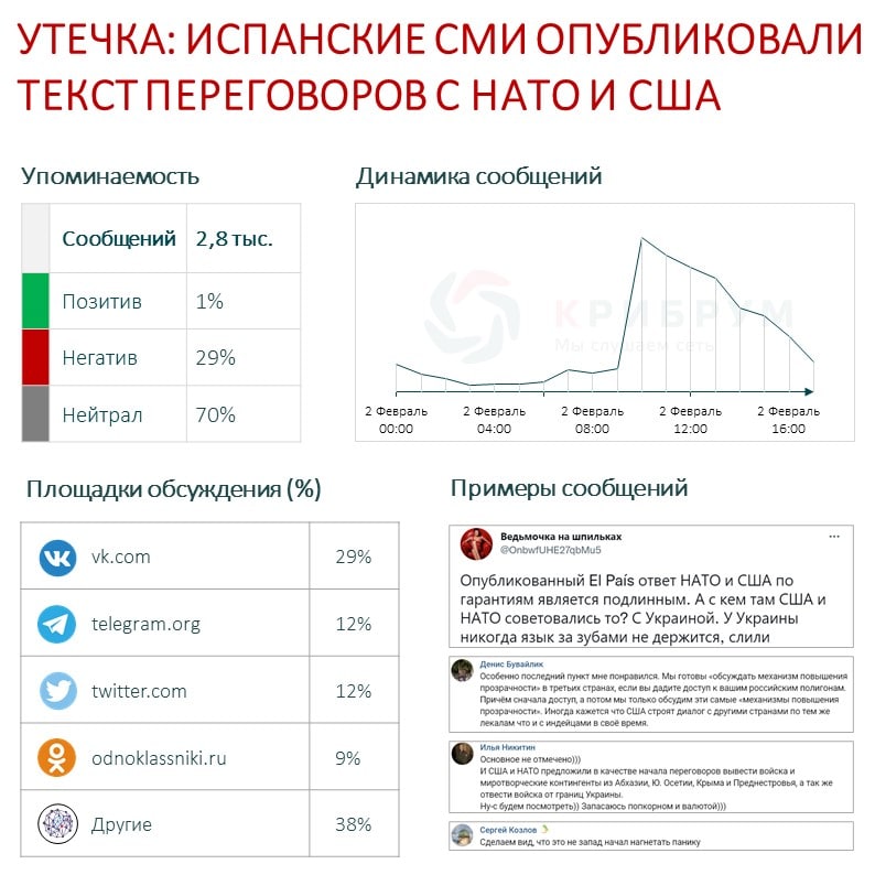 За несколько часов по теме было опубликовано более 2 тысяч сообщений. Основная часть упоминаний – публикации нейтрального характера от различных СМИ. На негатив пришлось 29% упоминаний, а на позитив – всего 1%. Многие комментаторы уверены, что документ, представленный испанскими СМИ – фейк и вброс, поскольку сведения об этих переговорах секретные и никто из сторон не подтвердили подлинность утечки. Другие же пользователи не сомневаются в подлинности документа и делятся версиями о том, что секретную информацию испанские СМИ получили со стороны Украины, поскольку журналист El Pais на момент публикации находился там. Также некоторые пользователи считают, что переживать по поводу утечки не стоит, поскольку ранее и так было озвучено большинство вопросов, представленных в документе.
