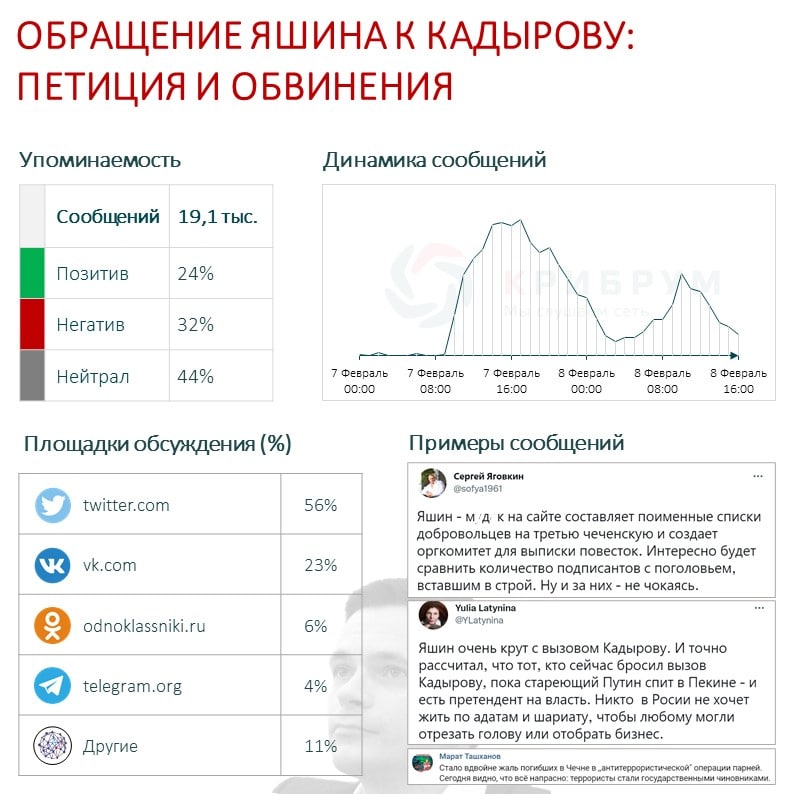 За два дня в Сети было опубликовано более 19 тысяч сообщений об обращении Яшина. Реакция пользователей оказалась неоднозначной: 24% упоминаний оказались позитивными, 32% негативными и 44% нейтральными. Многие пользователи соцсетей считают поступок Яшина невероятно смелым, поскольку этим обращением он подвергает себя опасности. По мнению комментаторов, с требованием отставки Кадырова должен был выступить президент, а не оппозиционный политик.
