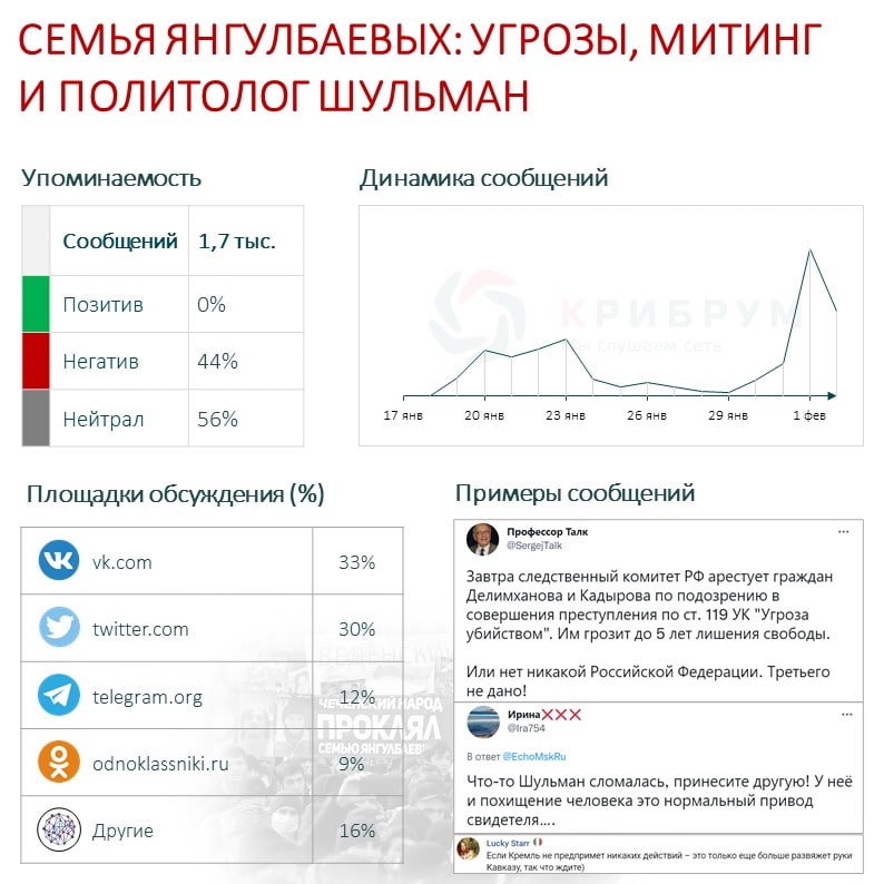 За две недели события вокруг семьи Янгулбаевых создали информационный отклик из 52 тысяч упоминаний, среди которых 56% нейтральные и 44% негативные. Большинство пользователей соцсетей были возмущены неприкрытыми угрозами со стороны должностных лиц и высказались о необходимости привлечь к ответственности всех, кто публично угрожал расправой. Также многие прокомментировали митинг в Грозном, проводя параллели с недавними протестами в других регионах и удивляясь, почему в иных случаях виновных и организаторов находили быстро, а здесь «не представляется возможным».