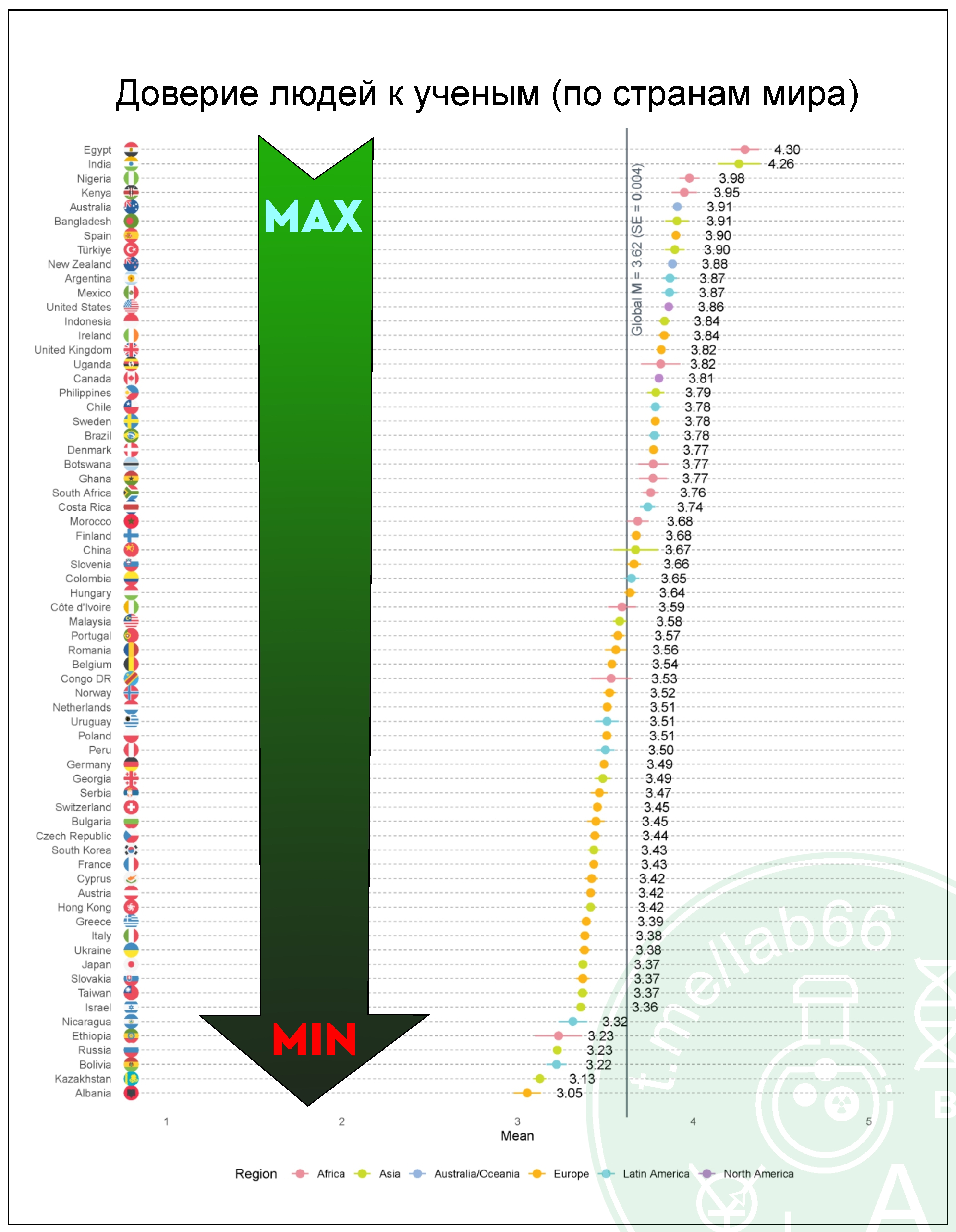 Исследователи из университета им. Лейбница в Ганновере опросили 71 417 человек в 67 странах. Изучался уровень доверия людей к ученым. Респондентам было предложено указать, насколько они согласны с десятком утверждений о добросовестности, компетентности, доброжелательности и открытости ученых по шкале от 1 до 5. Более высокий балл свидетельствовал о более высоком доверии.