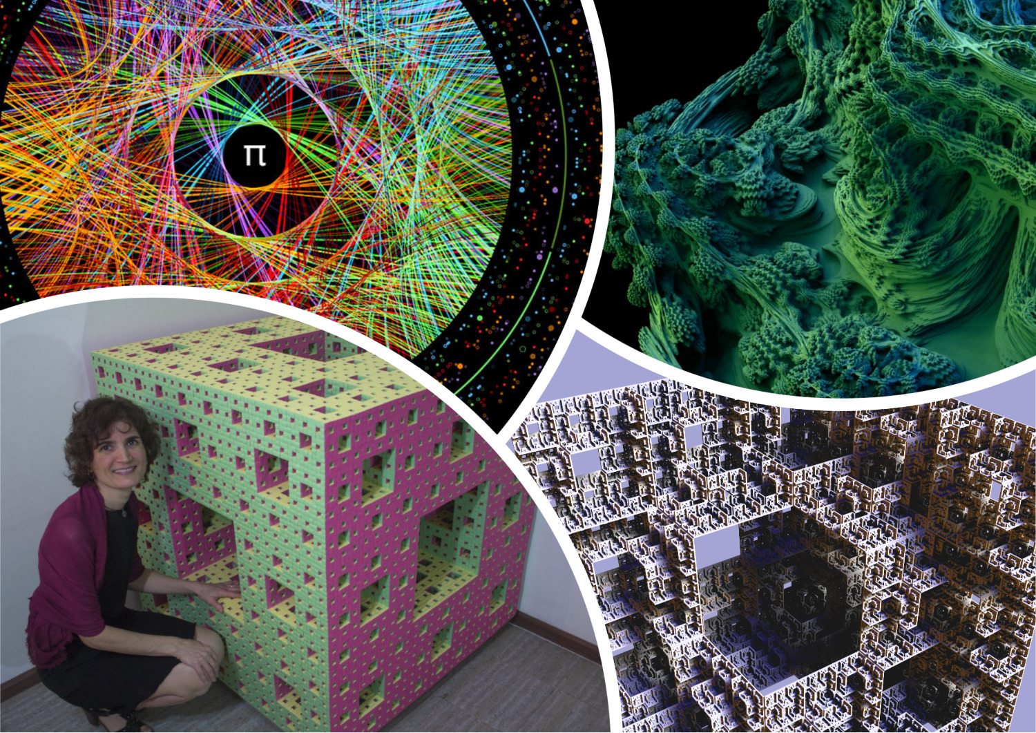 На фото: верхний ряд- Pi Digital Art oт польского художника Martin Krzywinski, пример трехмерного фрактала Мандельброта, т.н. mandelbulb. Нижний ряд - трехмерный вид ковра Серпинского - губка Менгера, и та же губка, но вид изнутри.
