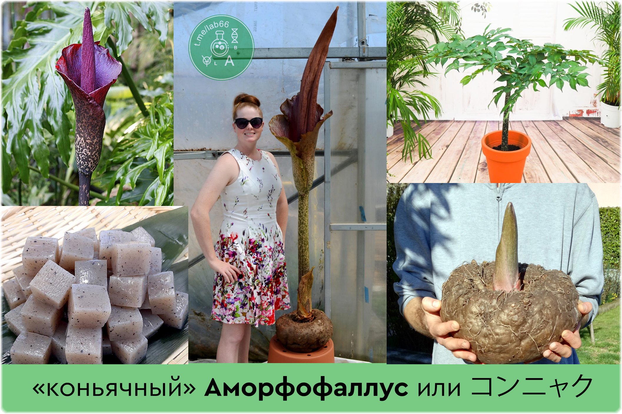 Называется этот гигант Аморфофа́ллус коньяк (лат. Amorphophallus konjac) или в японской foodtech традиции - конняку (яп. コンニャク). В русском языке чаще используется странноватая калька - конжак. Я же буду далее называть растение конняку.