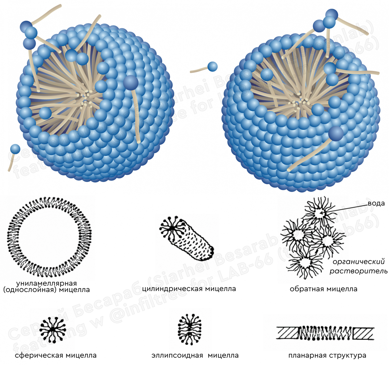 Мицелла - это та структура, которую одиночные ПАВ могут формировать в воде при определенных условиях (например, особой концентрации, Ее Величество ККМ). Именно мицеллы ПАВ уносят грязь с одежды во время стирки. Мицеллы могут быть разными, даже красивыми по-своему. Могут быть небольшими сферами или дисками (как желчные кислоты в организме человека), сплющенными или вытянутыми эллипсоидами, длинными цилиндрами, двухслойными плоскими (бислои) или даже формировать кубики. К сожалению увидеть их почти нереально, можно только одним методом - криоэлектронной микроскопии. Примерно разнообразие форм можно увидеть на картинке под этой заметкой.