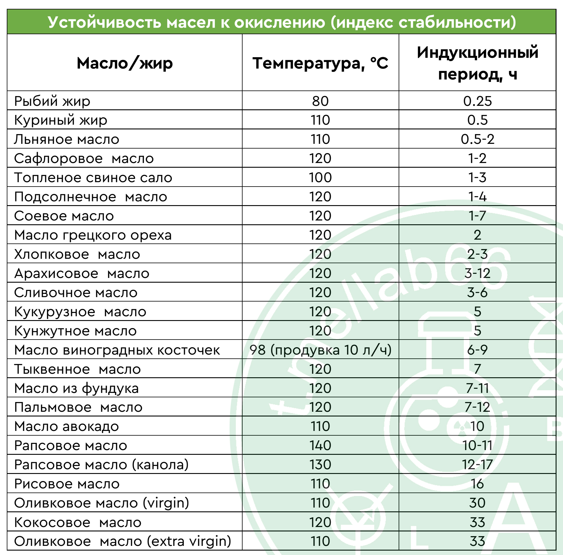 НА OSI ссылаются редко, потому что показатель может значимо отличаться в разных партиях или даже зависеть от типа упаковки. Поэтому в таблице для некоторых позиций указаны диапазоны. Возможно из-за этого информация по индексу стабильности в Интернете представлена крайне фрагментарно. Тем не менее, как дополнительный ориентир использовать эти цифры можно и нужно. Мне пришлось поскрести по инфосусекам, чтобы сделать сводную таблицу для некоторых распространенных объектов. Масла упорядочены в порядке возрастания стабильности, расчетные цифры для барботажа воздухом со скоростью 20 литров/час.
