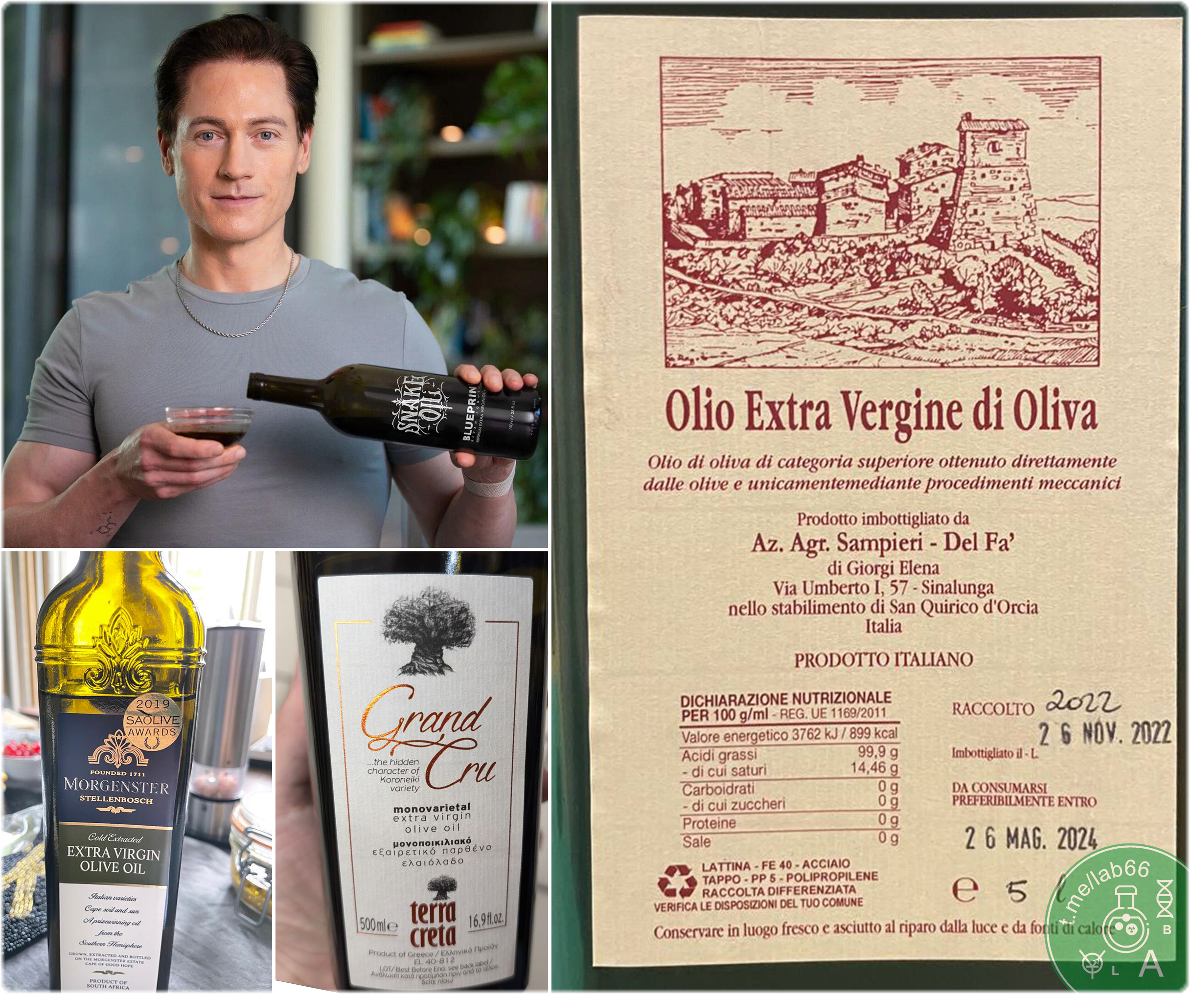 На фото: Брайан Джонсон с его snake oil, этикетка масла с указанием даты отжима, греческое Costa D'Oro l'integrale non filtrato, Morgenster Extra Virgin из ЮАР