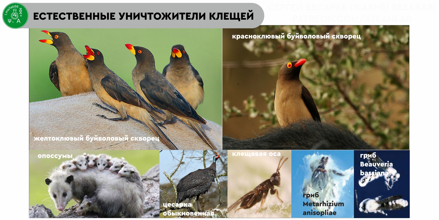Примеров хищных по отношению к клещу птиц немного. Достоверно установлено, что лучшие «акаридо-санитары» - это красивые африканские птицы - желтоклювый буйволовый скворец (Buphagus africanus) и красноклювый буйволовый скворец (Buphagus erythrorhynchus). У нас они тоже встречаются (но, к сожалению, редко) и носят название «волоклюй». Так вот эти птички способны уничтожать просто огромное количество эктопаразитов на животных (порядка тысячи клещей/птицу). Но из-за бесконтрольного использования пестицидов и сокращения популяций диких животных количество птиц постоянно уменьшается. В теории заменой волоклюю на приусадебных участках может послужить знакомая многим обыкновенная цесарка, которая клещей тоже может уничтожать (а бонусом еще и короладского жука с картофеля).