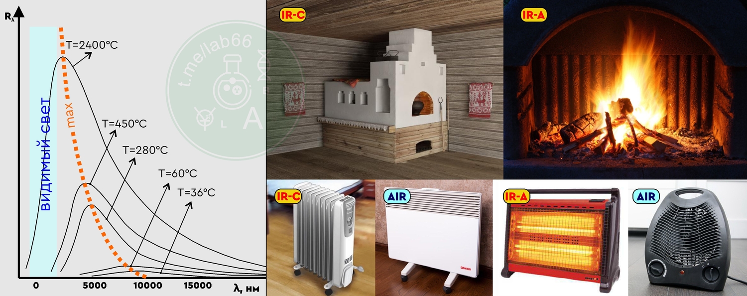 Длина волны, которую излучают нагретые предметы зависит от температуры тела. Например дрова, сгорающие в камине дают температуру ~600 °С и излучают большей частью средневолновое ИК с длиной волны 2500-50000 нм. Если жечь уголь (>800 °С) то излучение будет коротковолновым (< 2500 нм). В случае объектов с температурой < 300 °С в излучении будут преобладать длинные волны 50000-2000000 нм(стыдно прям писать вместо 2 мм два миллиона нанометров, но я за единообразие). Открытый огонь в печи излучает короткие волны (IR-A), а стенки печи в длинные волны (IR-C). В принципе отличать виды излучения не сложно, чем короче длина волны, тем более ярко (для глаз) светится объект.