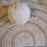 Небольшой коврик в туалет. Вязала узором "резинка крючком" из трикотажных клубочков. Получился достаточно плотный. Спасает ножки от холодного кафеля 🙂