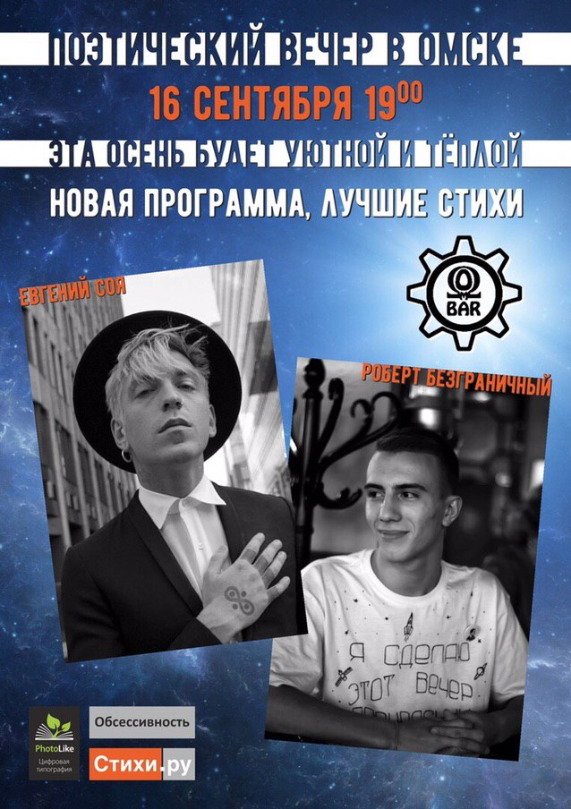 16 сентября, в понедельник, на поэтическом вечере для вас свои произведения прочтут Евгений Соя (Одесса) и Роберт Безграничный (Омск).