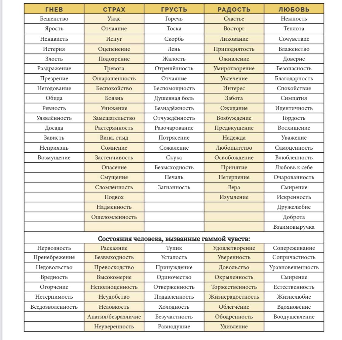 А про чувства, особенно если вы склонны рассказывать о них долго и пространно, советую сверяться вот с этой простой табличкой. Я уверена, что ответ на вопрос «что ты чувствуешь?» не занимает больше 30 секунд)