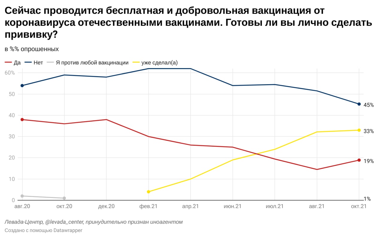 Половина россиян боятся заболеть коронавирусом, столько же — не боятся. Доля россиян, не готовых сделать прививку, плавно снижается на протяжении полугода. Больше половины респондентов считают, что главные трудности, связанные с коронавирусом, еще впереди. Наиболее популярной мерой для борьбы с эпидемией стала обязательная вакцинация для отдельных групп граждан. Наименее популярной — локдаун. 61% россиян считают, что коронавирус — биологическое оружие.