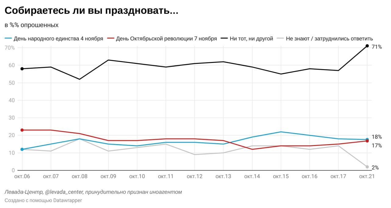 В ноябре респондентам запомнились прежде всего события, связанные с коронавирусом: введение QR-кодов, появление нового штамма “омикрона” (16% россиян). Еще 15% респондентов отметили аварию на шахте “Листвяжная”; 5% - миграционный кризис на белорусско-польской границе; по 4% - рост напряженности между Украиной и Россией и смерти известных людей.