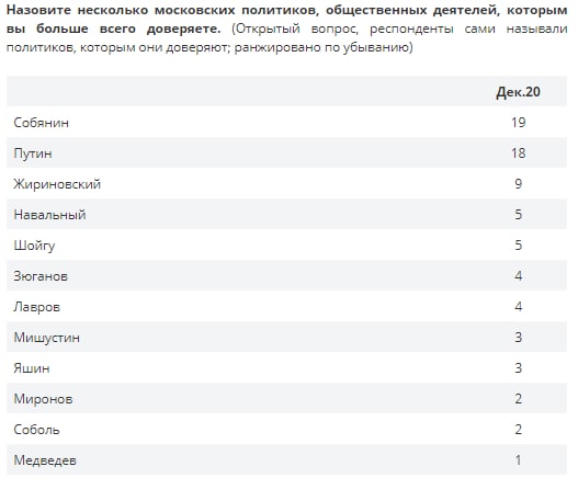 Москвичи лучше относятся к деятельности президента и мэра, чем к работе выборных муниципальных и региональных органов власти. Оценки работы московских властей за полгода практически не изменились. Однако снизилось количество москвичей, которые готовы голосовать за Владимира Путина на президентских выборах. Среди политиков, пользующихся доверием москвичей, преобладают фигуры федерального масштаба. Илья Яшин – единственный «москвич», попавший в первую десятку.