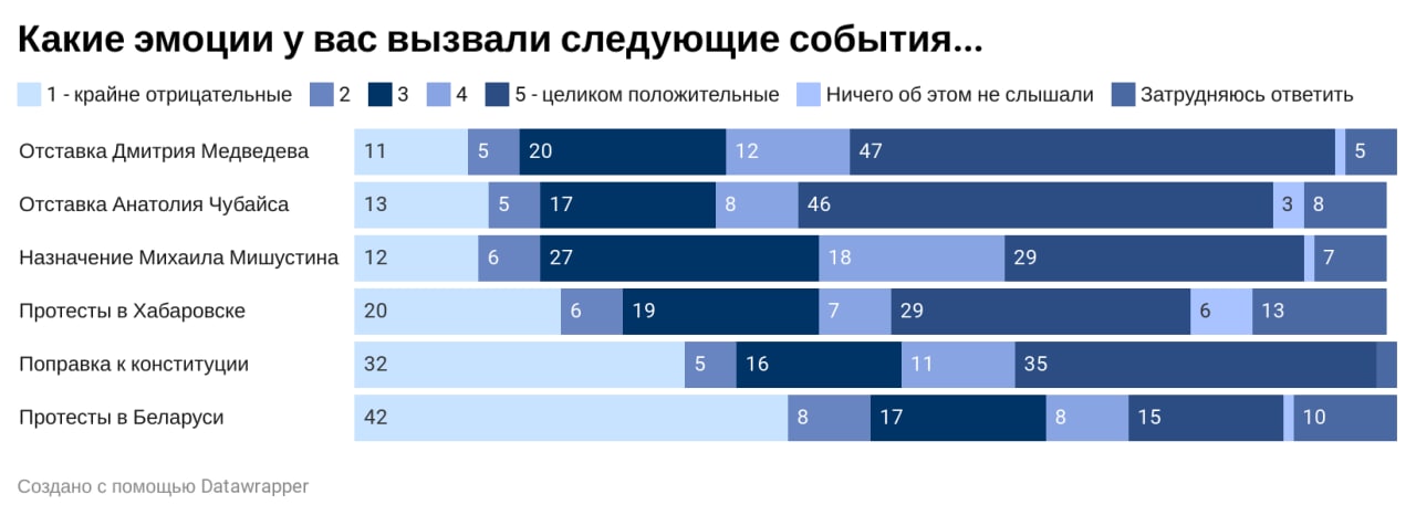 Мнение россиян разделилось по вопросу об «обнуляющей» конституционной поправке – и по возрасту, и по размерам населенных пунктов и по полу. Гораздо единодушнее и скорее положительно они отнеслись к отставке Дмитрия Медведева и назначению Михаила Мишустина. Протесты в Беларуси вызвали среди россиян в основном негативные эмоции. Протесты в Хабаровске – смешанные.