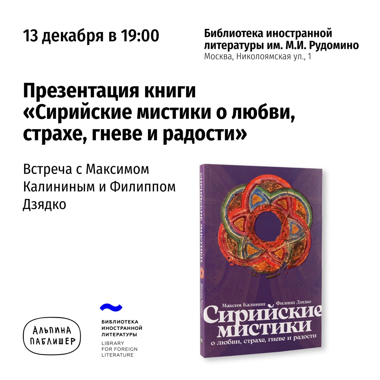 По мотивам нашего подкаста «Отвечают сирийские мистики» вышла книга «Сирийские мистики о любви, страхе, гневе и радости». В эту пятницу, 13 декабря, в 19:00 состоится ее презентация в Библиотеке иностранной литературы.