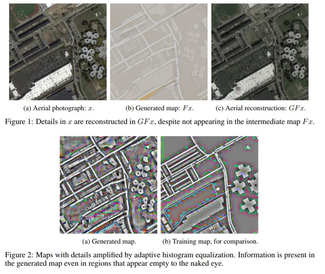 > CycleGAN learns to “hide” information about a source image into the images it generates in a nearly imperceptible, high frequency signal. This trick ensures that the generator can recover the original sample and thus satisfy the cyclic consistency requirement, while the generated image remains realistic