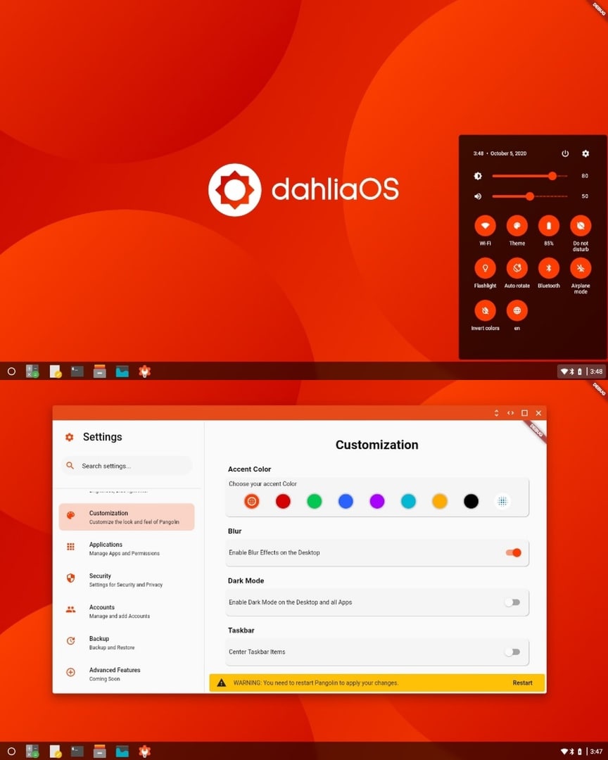 Для запуска сторонних программ в окружении Pangolin предлагается встроенная поддержка изолированных контейнеров, в которых можно запустить любое не связанное с dahliaOS приложение. Для систем с UEFI поставляется приложение system-recovery, позволяющее в случае проблем с системой автоматически загрузить свежий образ dahliaOS и загрузиться с его использованием.