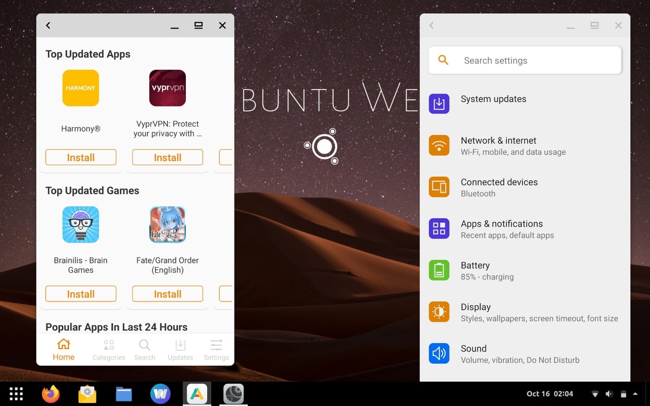 Особенностью новой версии является предоставление окружения для выполнения Android-приложений, построенное с использованием пакета Waydroid, позволяющего в обычном Linux-дистрибутиве сформировать изолированное окружение для загрузки полного системного образа платформы Android. В Waydroid-окружении предлагается /e/ 10, ответвление от платформы Android 10. Поддерживается установка Android- и web-приложений (PWA), распространяемых для платформы /e/. Android-приложения могут запускаться бок о бок с web-приложениями и родными приложениями для Linux.