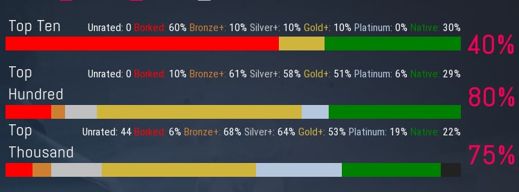 Кроме того, по данным сервиса protondb.com, при рассмотрении 1000 наиболее популярных игр уровень поддержки составляет 75%, а Top10 - 40%. В общем виде из 21244 протестированных игр работоспособность подтверждена для 17649 игр (83%).