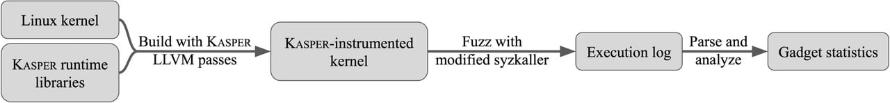 При тестировании ядро связывается с runtime-библиотеками Kasper и проверками, работающими на уровне LLVM. В процессе проверки производится эмуляция спекулятивного выполнения кода, реализованная при помощи механизма checkpoint-restore, который специально выполняет неверно предсказанную ветвь кода, после чего откатывается к исходному состоянию до начала ветвления. Kasper также пытается моделировать различные программные и аппаратные уязвимости, анализирует влияние архитектурных и микроархитектурных эффектов, и выполняет fuzzing-тестирование возможных действия атакующего.
