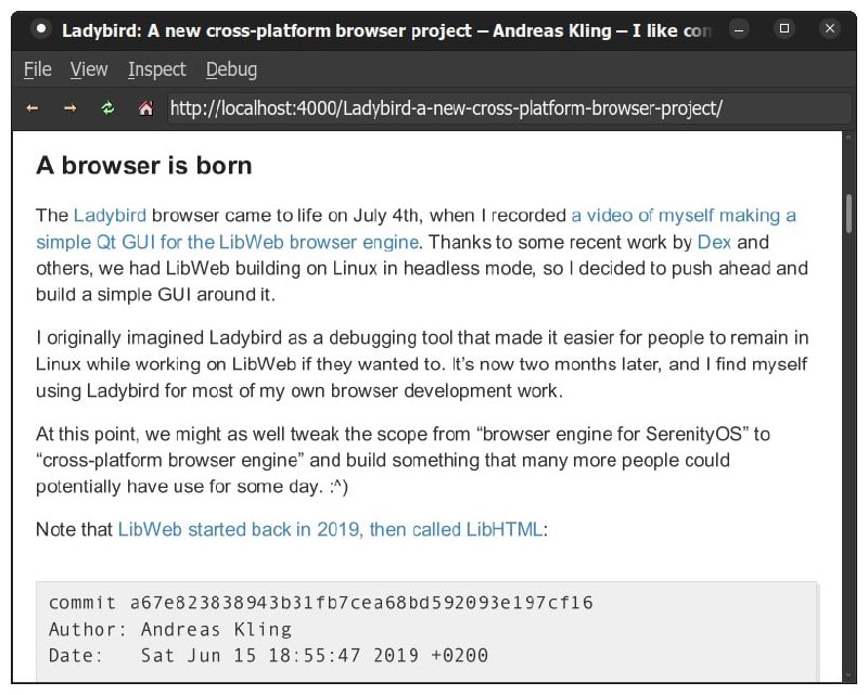Разработчики SerenityOS представили кросс-платформенный web-браузер Ladybird, основанный на движке LibWeb и JavaScript-интерпретаторе LibJS. Графический интерфейс основан на библиотеке Qt. Код написан на языке C++ и распространяется под лицензией BSD. Поддерживается работа в Linux, macOS, Windows (WSL), Android и Haiku.