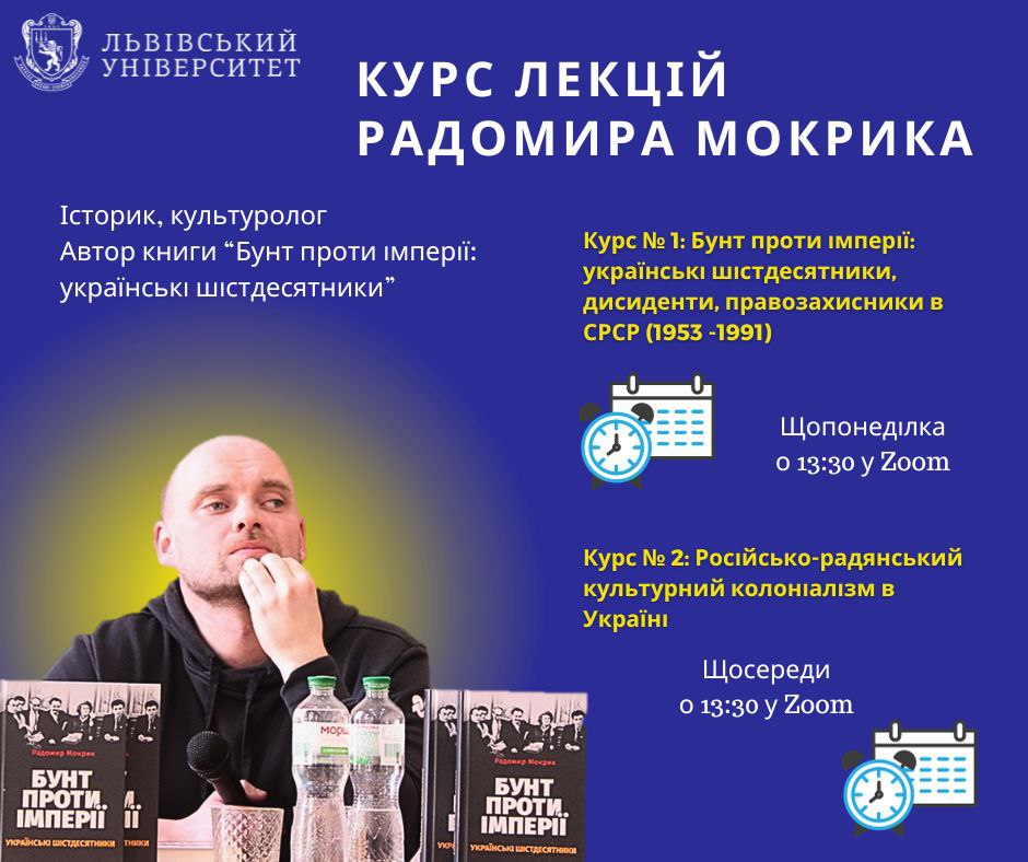 Вже незабаром на філософському факультеті Львівського національного університету імені Івана Франка розпочинаються одразу два безкоштовних курси від історика, культуролога, наукового працівника Інституту східноєвропейських студій Карлового університету (м. Прага, Чехія), автора книги «Бунт проти імперії: українські шістдесятники» Радомира Мокрика.