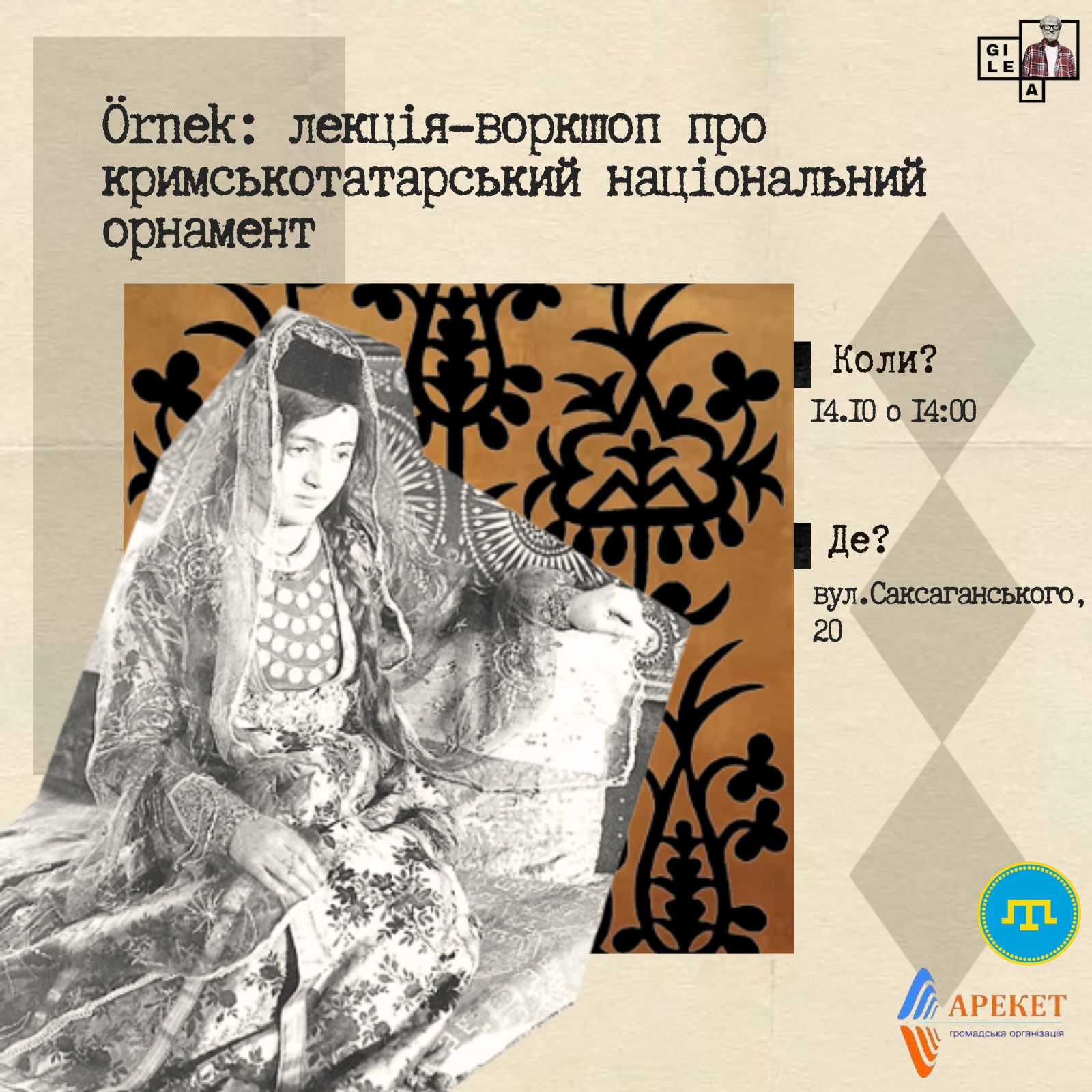 Запрошуємо на лекцію-воркшоп про Örnek (орьнєк) — кримськотатарський орнамент, елементи якого прикрашають національне вбрання, предмети побуту та інтер'єру, і який віднедавна входить до Списку нематеріальної культурної спадщини людства UNESCO.