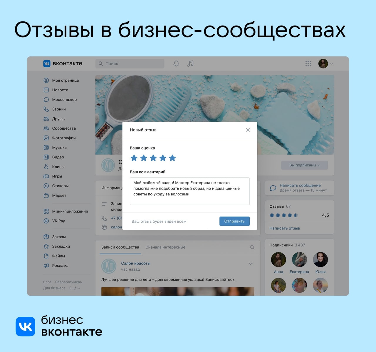 Теперь в бизнес-сообществах ВК можно будет увидеть плашку со звездочками. Как на OZON или Яндекс Маркете. И еще реальные отзывы покупателей и клиентов.