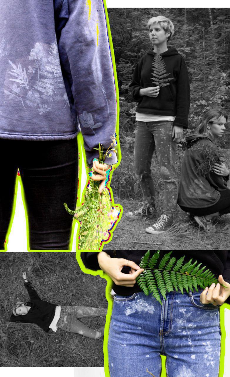 Линию одежды с отпечатками растений средней полосы создали участники мастерской «Танец» Валя, Ксюша и Саша. Для создания принтов использовались листья черники, папоротника, цветки тысячелистника и клевера, а также шишки.