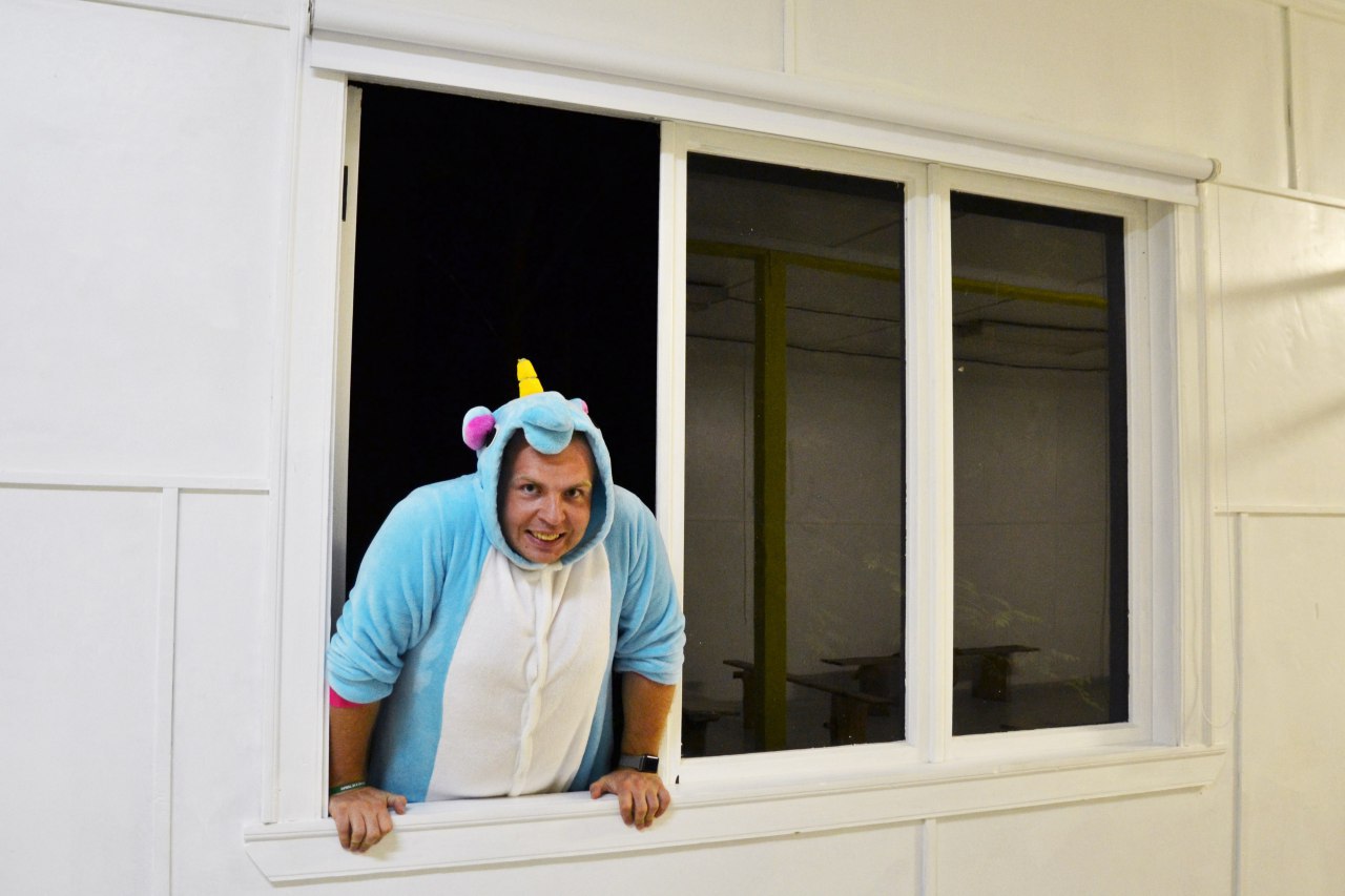 Накануне мимо дежурных на КПП проскакал неизвестный в костюме единорога. Он предложил участникам посмотреть сериал Twin Peaks, направив проектор на деревья. Осмотрительные дежурные отказались, но идеей незнакомца они решили поделиться с Пресс-избой ЛШ. Мы выяснили, кем был загадочный человекорог — им оказался лектор ПсихО Григорий Мисютин.
