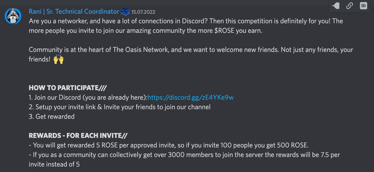 Идея: пригласить 100 рефералов (загнать свои акки) в дискорд Oasis Network (94-место на СМС). Денег у проекта doxya, склоняюсь что выплатят как положено, тем более за ноду платили. В конце мероприятия надо заполнить форму на получение токенов и пройти КУС. Конец 4 августа.