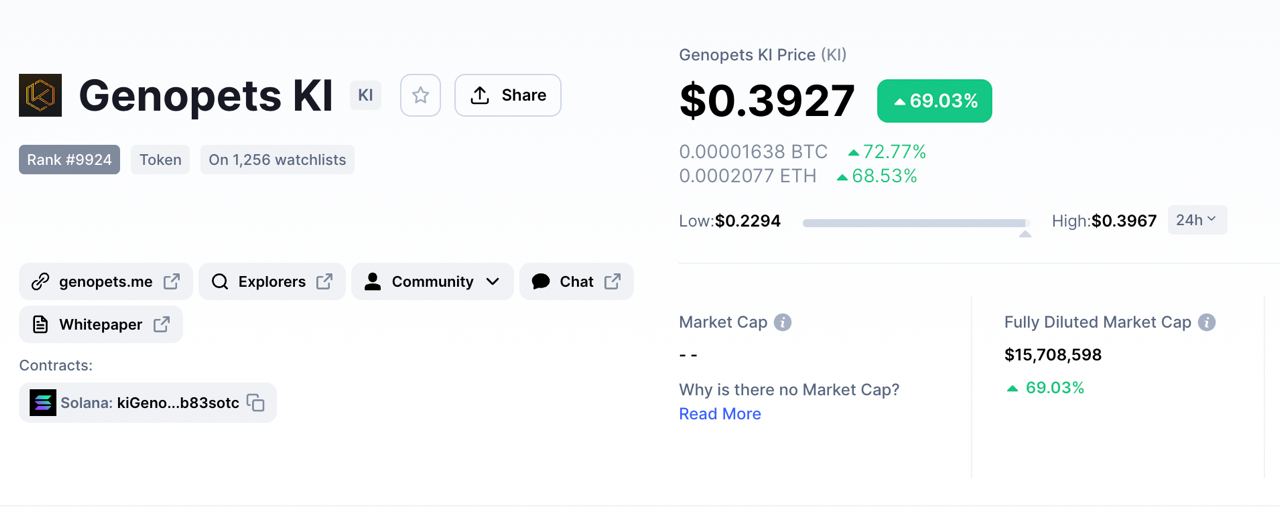 Идея: инвестировать в игровой токен M2Е проекта Genoptes. Токен назвается KI. Если меня читаете, то знаете, что я написал статью про игровые токены и как они пампятся. Короче, запустилось приложение гемного проекта, второго по крутизне из m2е.z Токен за 1 день поднялся на 70%. Хочется верить, что будет огонь, в принципе ничто не мешает подтолкнуть его вверх. Это, мать его, Genopets.