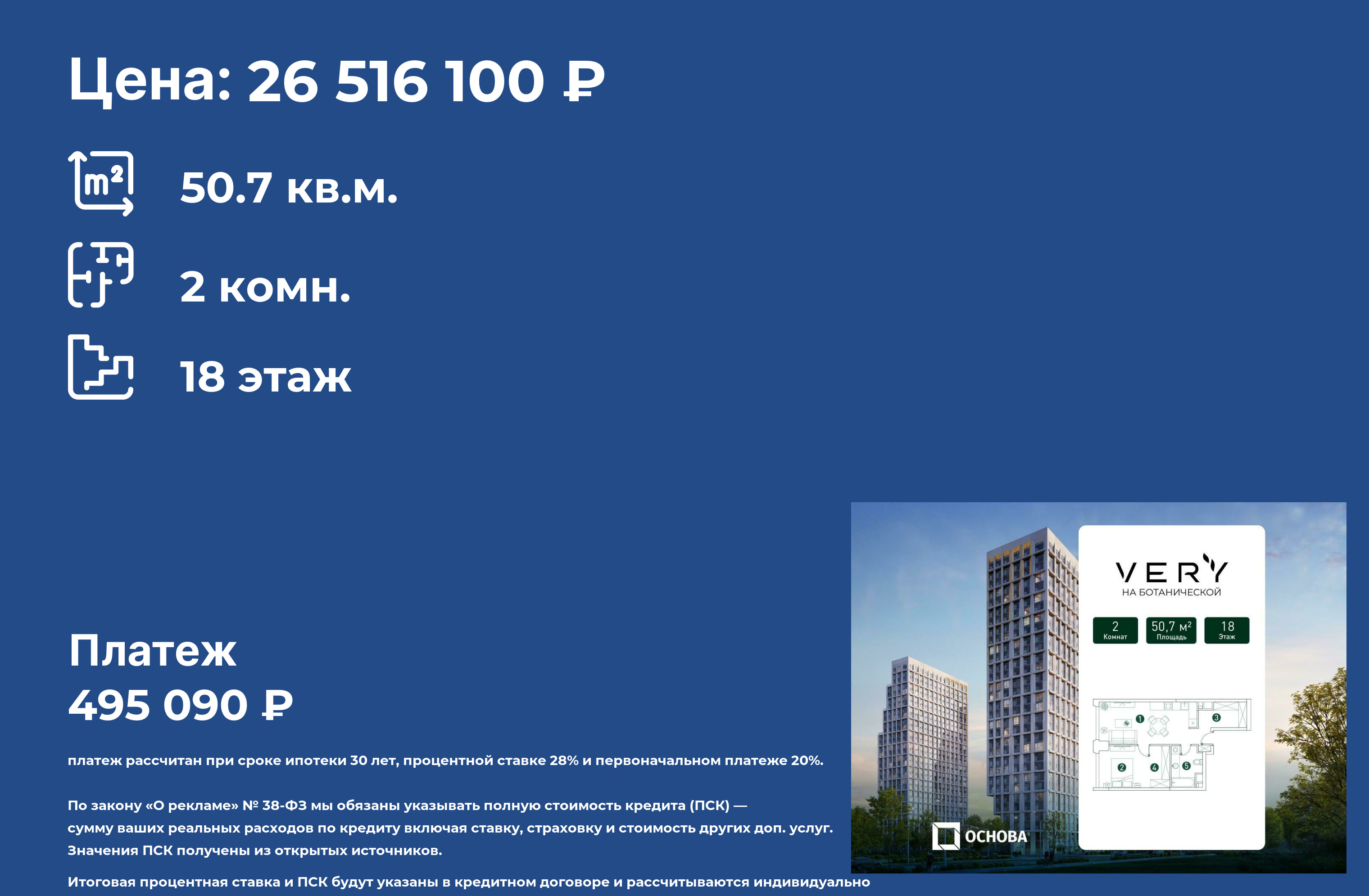 ℹПродается 2-к квартира площадью 50.7 кв.м. на 18-м этаже 31 этажного дома в ЖК "Very" от ГК ОСНОВА.