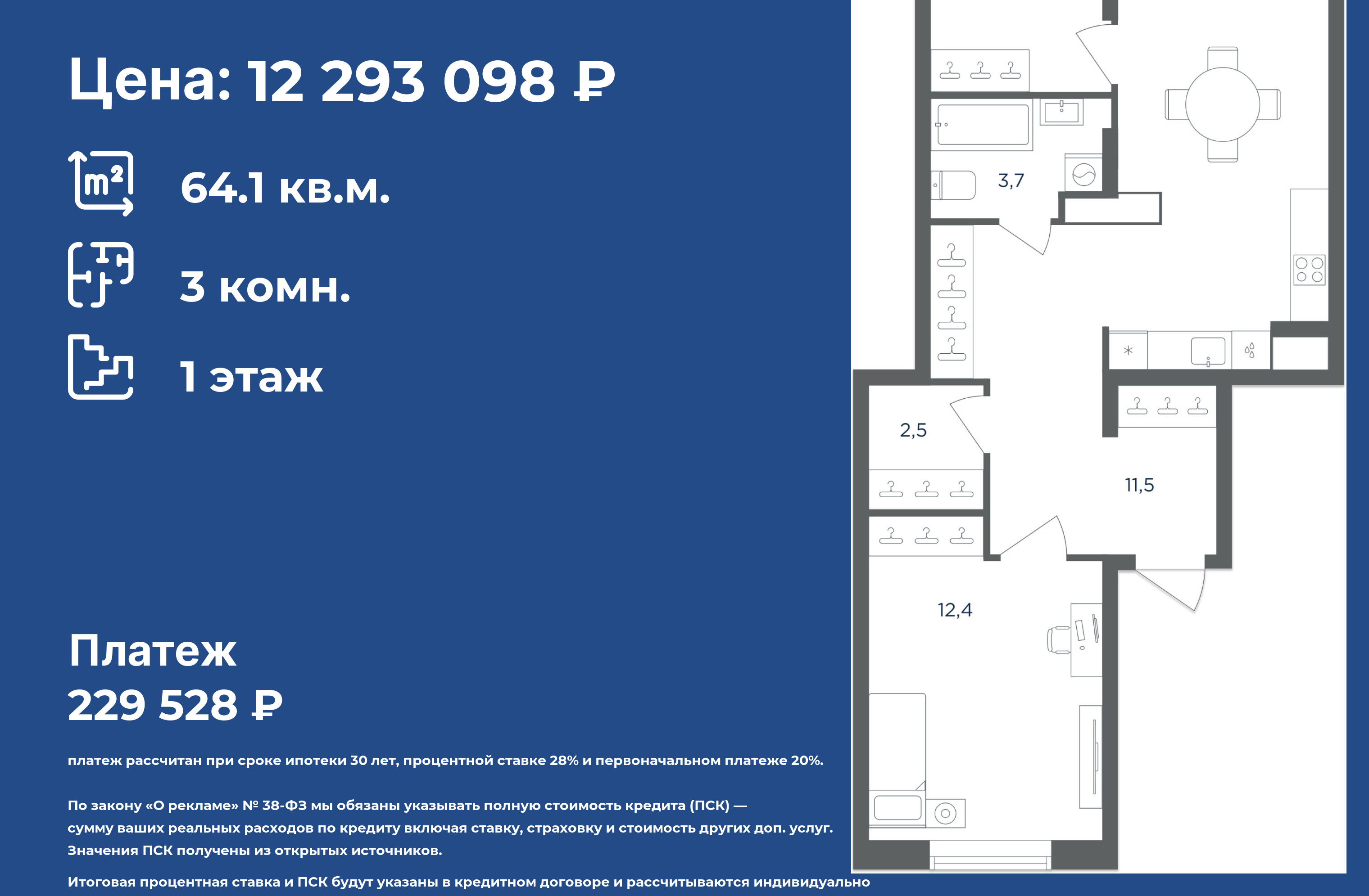 Продаётся 3-к квартира площадью 64.10 кв.м. на 1-м этаже 5 этажного дома.