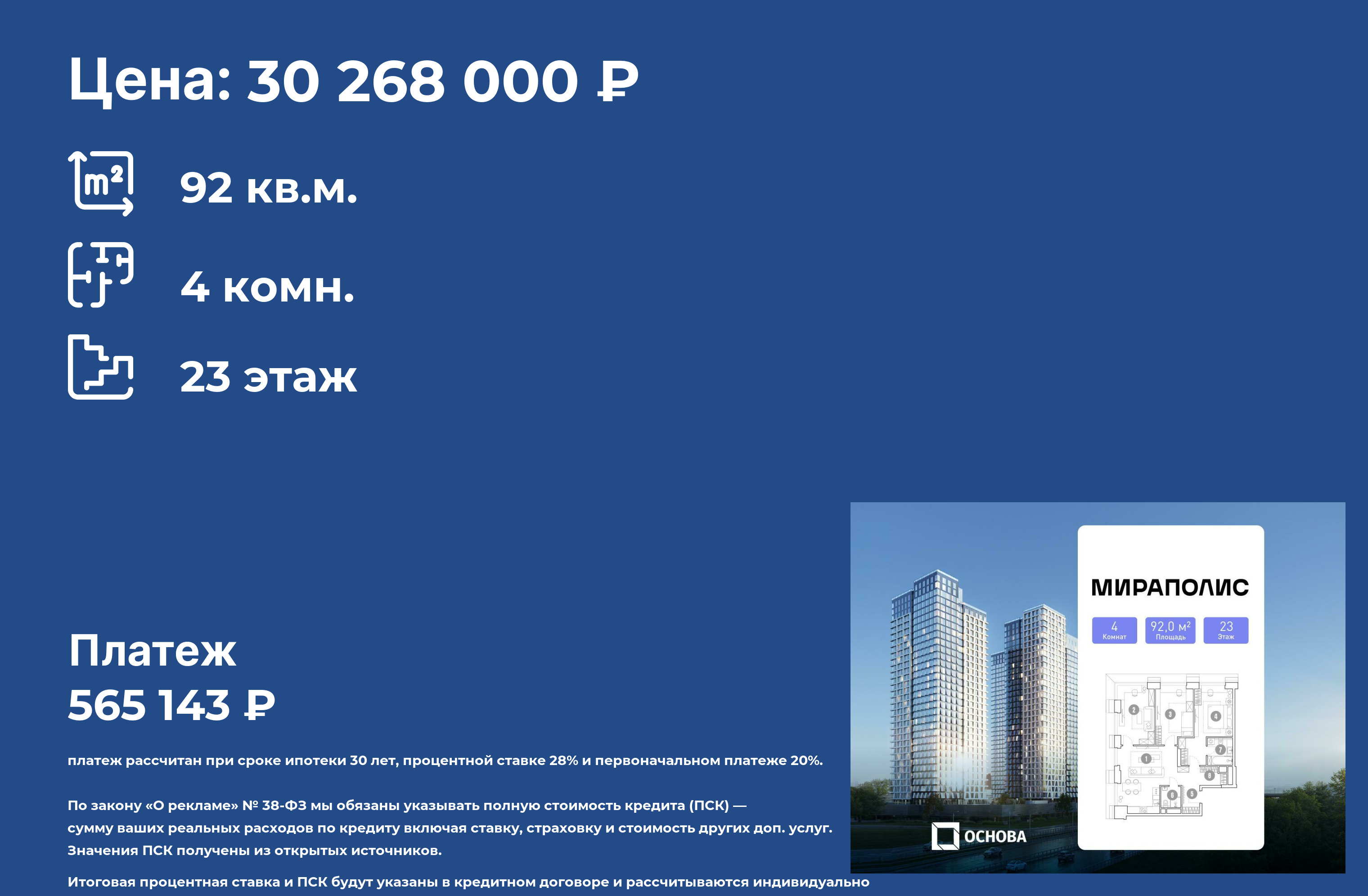 ℹПродаются 4-к апартаменты площадью 92.0 кв.м. на 23-м этаже 33 этажного дома в ЖК "Мираполис" от ГК ОСНОВА.