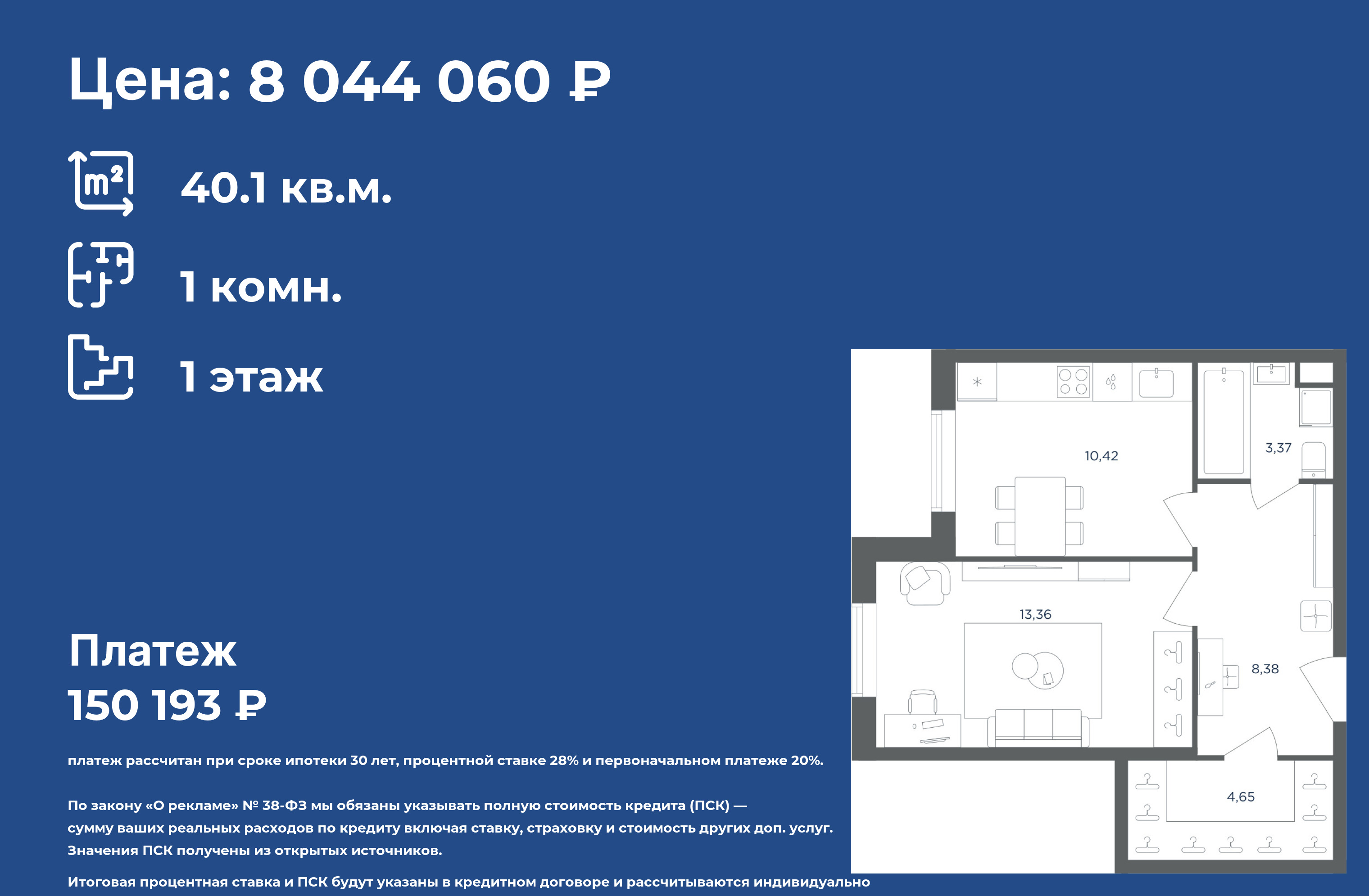Продаётся 1-к квартира площадью 40.10 кв.м. на 1-м этаже 5 этажного дома.