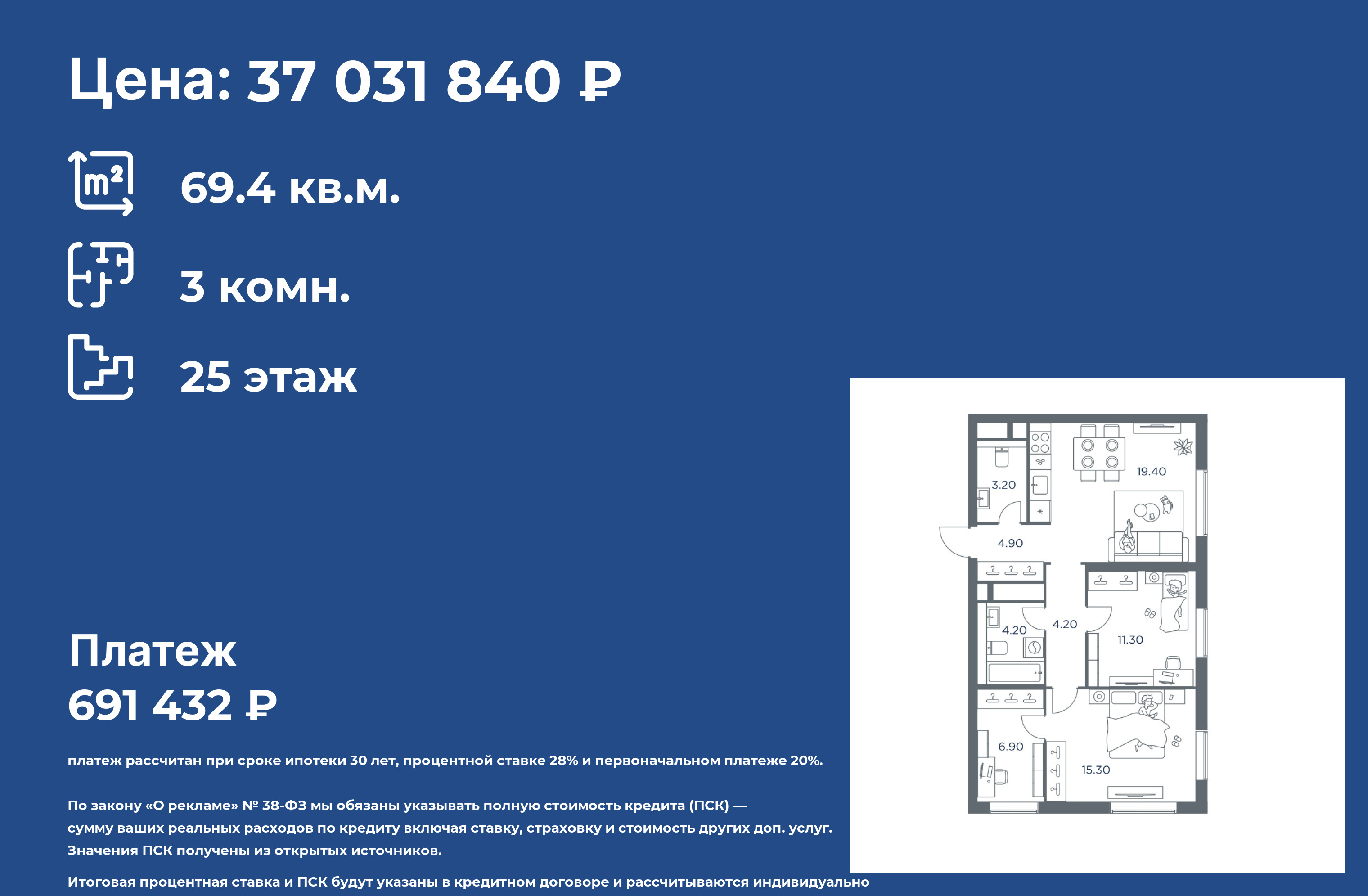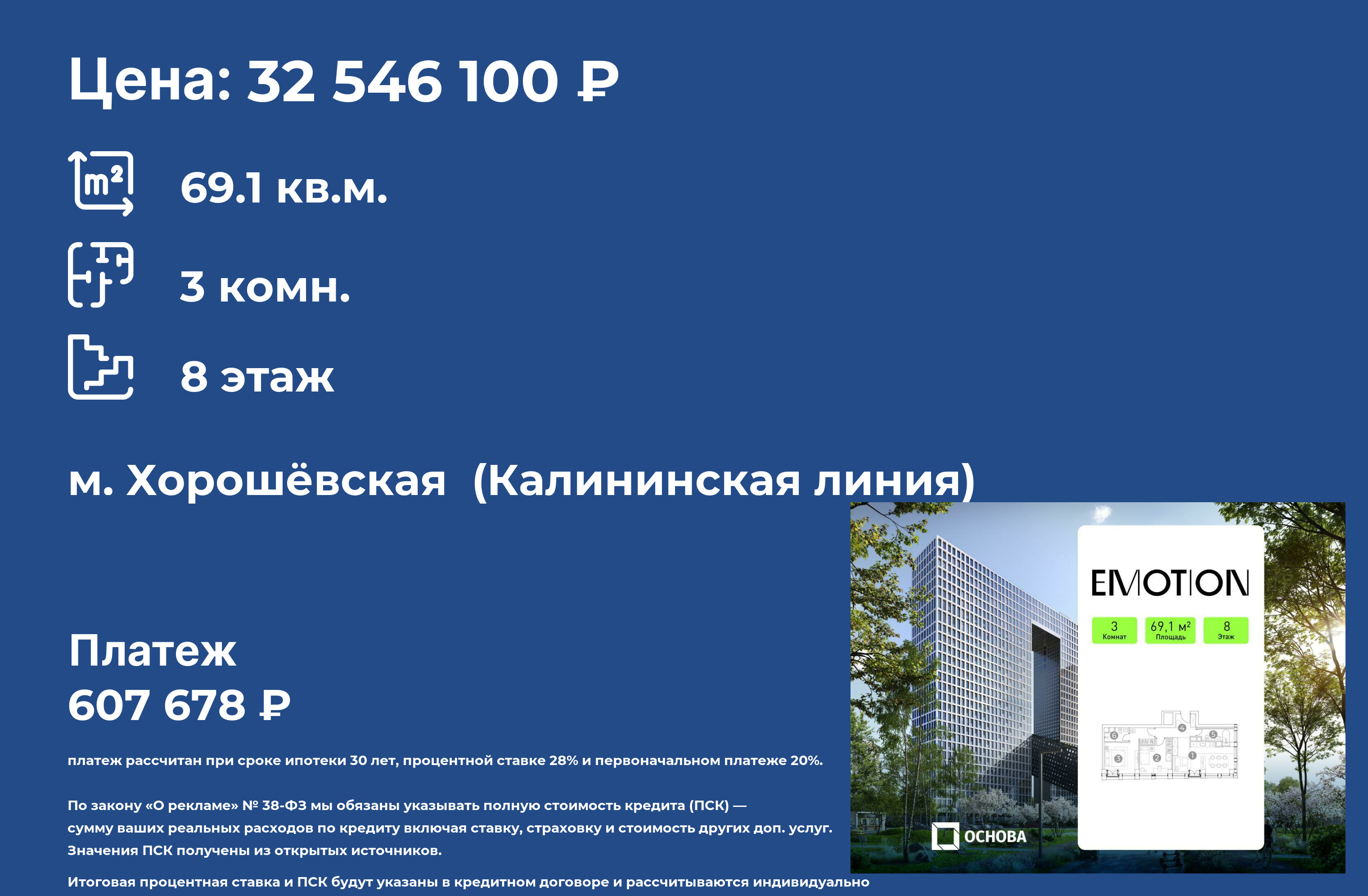 ℹПродаются 3-к апартаменты площадью 69.1 кв.м. на 8-м этаже 28 этажного дома в "Emotion" от ГК ОСНОВА
