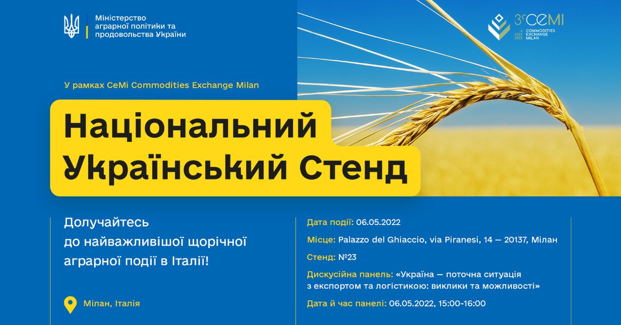 Міністерство аграрної політики та продовольства України організовує Національний Український Стенд на СeMI - Commodities Exchange Milano 6 травня у Мілані (Італія) - https://cemi-milano.com/en/.