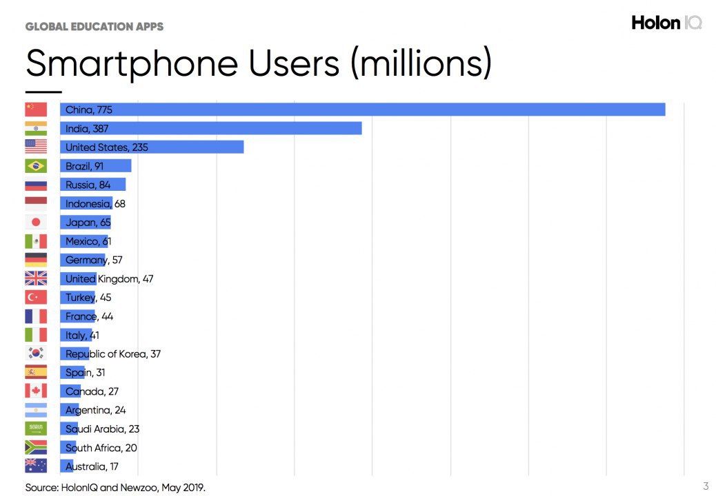 🔥 Активное распространение дешевых смартфонов (Android) среди населения и, как следствие, mobile first в потребление образовательного контента. По данным HolonIQ сейчас в Индии насчитывается почти 400 миллионов пользователей смартфонов. Большая часть образовательного контента, включая онлайн-курсы, теперь полностью оптимизирована для мобильных устройств. Интересной особенностью индийского рынка стал фокус на обучение на основе видео. 70% интернет трафика приходится именно на этот контент. Как пример, у образовательного стартапа Byju's, который помогает школьникам с помощью видео разобраться в школьной программе, более 35 миллионов зарегистрированных пользователей и около 2,4 миллиона из них являются платными клиентами.